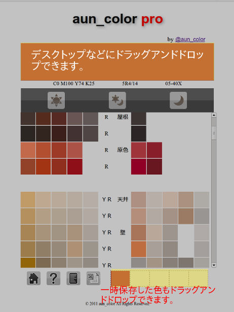 上の領域に色が表示されている状態でパレットをクリックすると、色の一時保存ができます。一時保存された色は、ドラッグアンドドロップして、デスクトップなどに保存することができます。